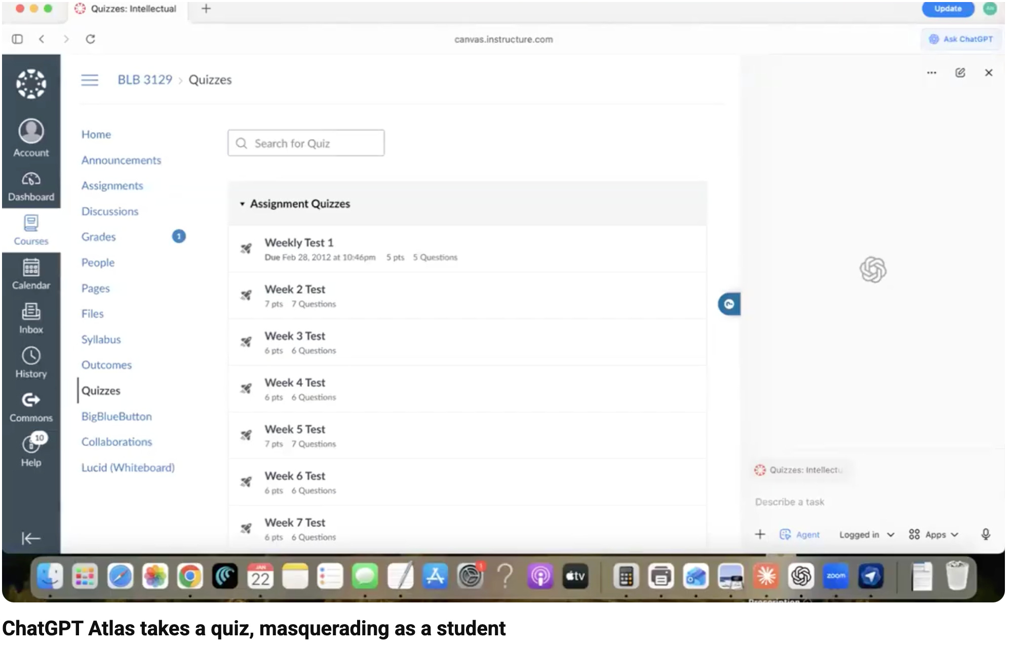 An AI browser agent moves the cursor, clicks, and completes a quiz in a learning management system without any human intervention. It raises no academic integrity objections. Watch the video.